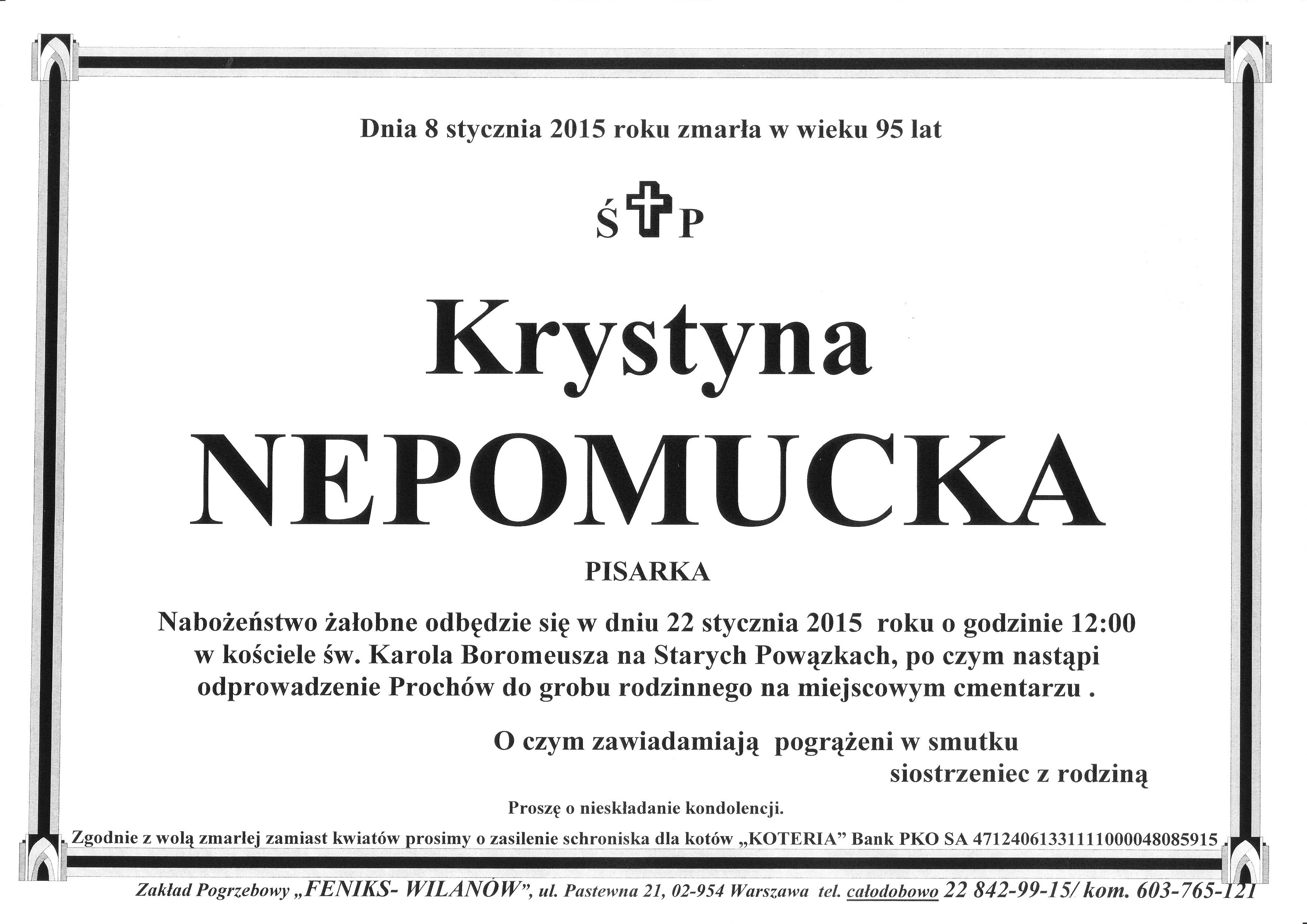 Pisarka Krystyna Nepomucka zmarła 8 stycznia 2015 roku w Warszawie. Miała 95 lat. Była autorką ponad 30 książek, m.in. słynnej powieści „Małżeństwo niedoskonałe”.