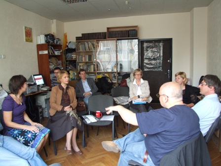 Po południu odbyliśmy kolejne ważne spotkanie z dziennikarzami z Niezależnego Związku Zawodowego Mediów Ukrainy (NMPU). W siedzibie związku obecni byli: prezes Yuriy Lukanov, sekretarz Serhiy Gooz, członek zarządu IMTUU Ostap Kryvdyk, Olga Padiriakova, członek jury konkursu organizowanego przez SDP dla dziennikarzy ukraińskich. Plan spotkania był taki sam jak w przypadku NSJU, jednak tym razem nasi Partnerzy skoncentrowali się na problemie walki o wolność słowa i swoich sukcesach na tym polu. Bardzo ciekawie opowiadała o monitorowaniu mediów dziennikarka portalu "Telekritika", pani Svitlana Ostapa.