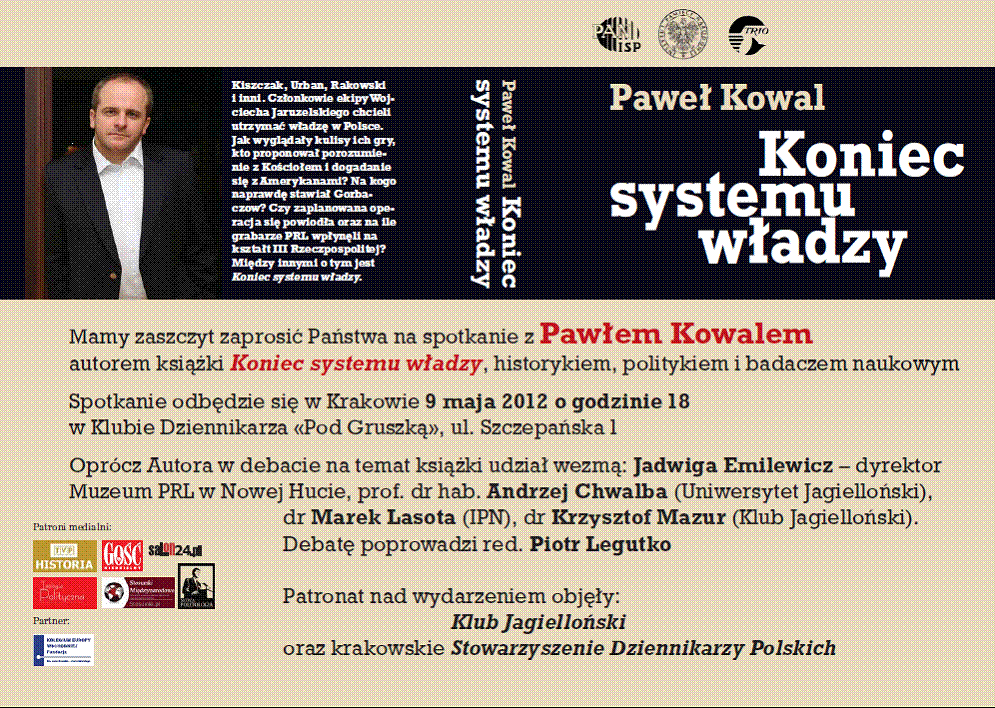 Pod patronatem krakowskiego Stowarzyszenia Dziennikarzy Polskich oraz Klubu Jagiellońskiego odbędzie się w Krakowie spotkanie z Pawłem Kowalem, autorem książki "Koniec systemu władzy" - w Klubie Dziennikarzy "Pod Gruszką" przy ul. Szczepańskiej 1.