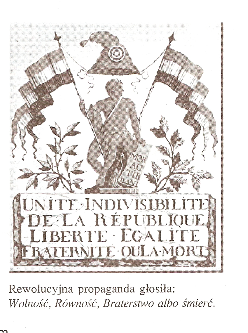 . Rewolucja francuska głosiła szczytne, jak nam wmawiano, idee. Albowiem jej aksjologię wyrażają niby trzy słowa: „wolność, równość, braterstwo”. A czy wiemy, że był jeszcze spójnik przeciwstawny, powiedziałbym: alternatywny, wobec owych trzech pojęć i rzeczownik? Dosłownie: „wolność, równość, braterstwo albo śmierć”.