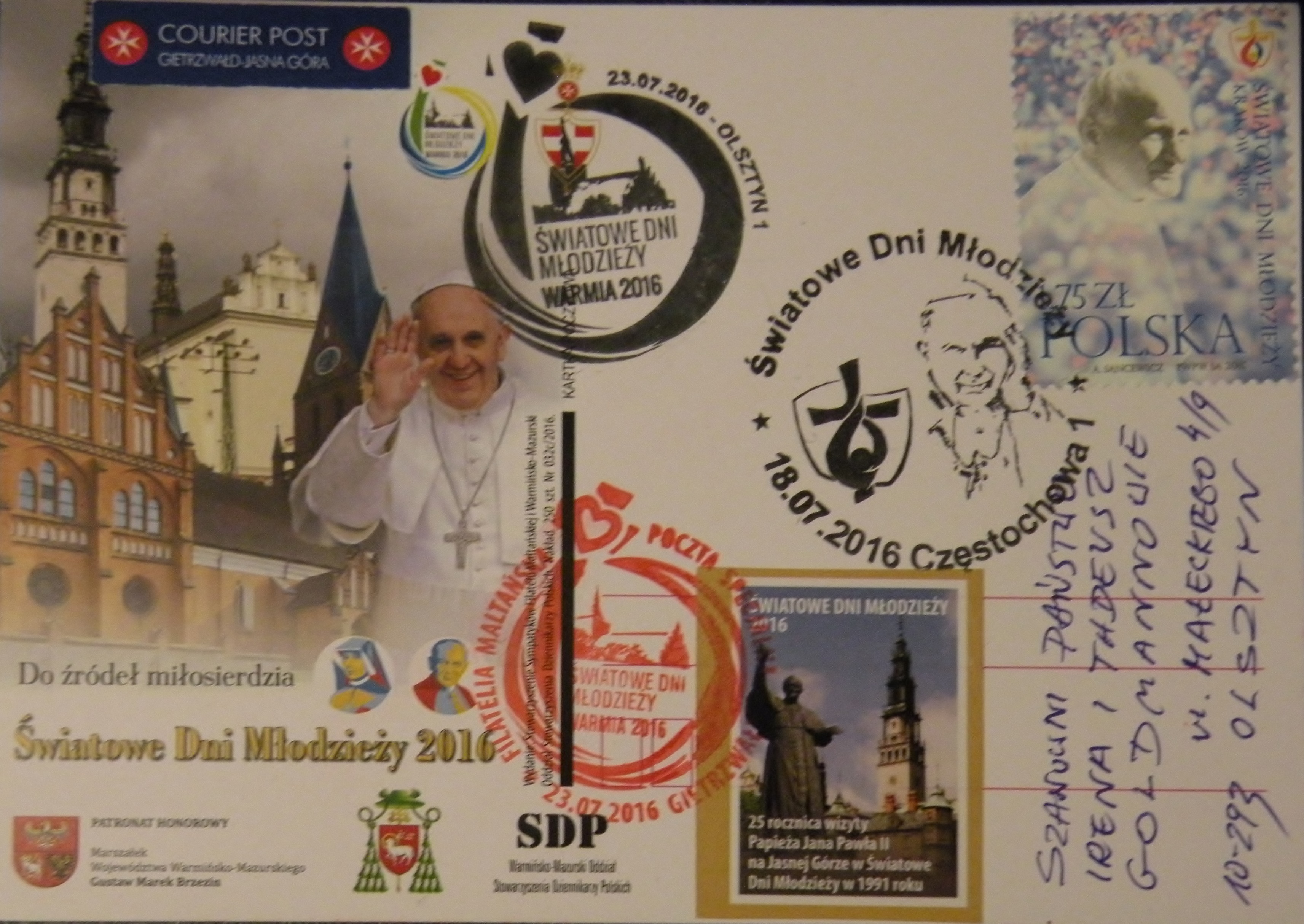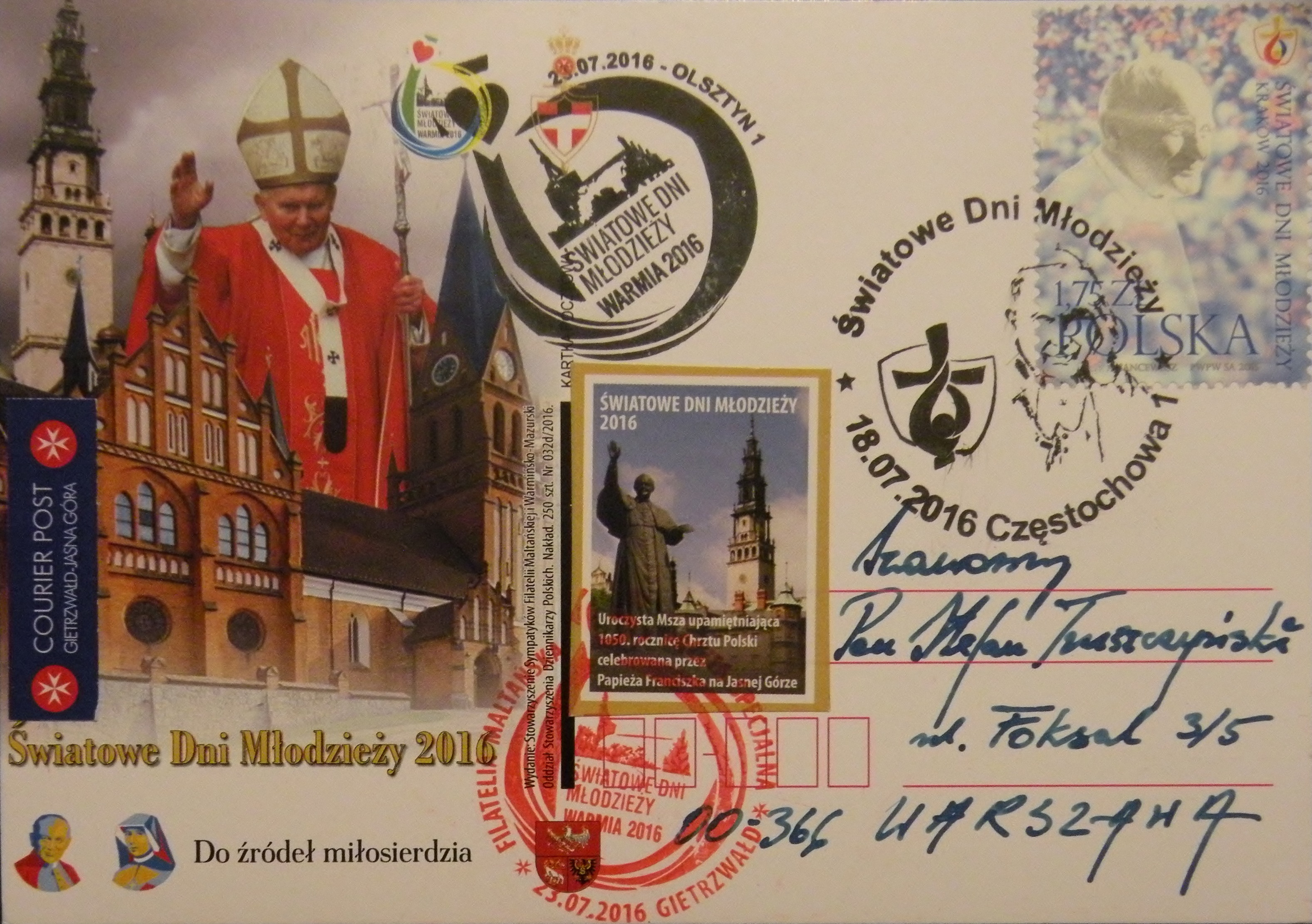 Oprócz tego powstały trzy karki pocztowe związane z jasnogórskim etapem papieskiego pielgrzymowania. Na karkach przedstawiono sanktuarium i pomnik papieża Jana Pawła na Jasnej Górze i napis: „Światowe Dni Młodzieży 2016” oraz określenia wydarzeń, kolejno: „W 25. rocznicę wizyty Papieża Jana Pawła II na Jasnej Górze w Światowe Dni Młodzieży w 1991 roku”, „W 25. rocznicę Poczty Drużyny Harcerskiej »Czarna Jedynka«” i na trzeciej kartce „Uroczysta Msza upamiętniająca 1050. rocznicę Chrztu Polski, celebrowana przez Papieża Franciszka na Jasnej Górze”.