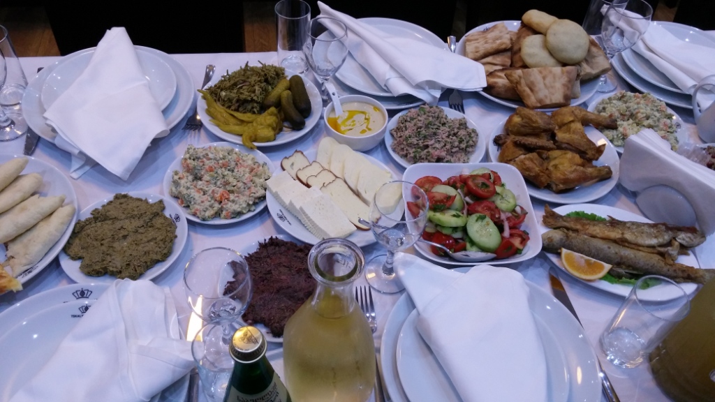 Osobny rozdział mej relacji powinien być poświecony gruzińskiej kuchni. Chinkali – pierożki z mięsem oraz rosołem w środku, chaczapuri – placki z serem lub mięsem, lobio – potrawa z czerwonej fasoli, tołma - „gołąbki” owinięte liśćmi winogron, szaszłyki bogactwo świeżych warzyw i owoców, kiszonek, najróżniejszych serów (zwłaszcza wędzonych)…mógłbym tak wymieniać niemalże bez końca. Tutaj jeszcze jedno spostrzeżenie – gruzińskie zwierzęta hodowlane są takie chyba tylko z nazwy, gdyż miejscowe krowy, owce, kozy, kury, świnie, itp. mają niemalże całkowitą swobodę wybiegu. Może to jest właśnie sekret tego, dlaczego mięso czy sery są w tym kraju tak smaczne. A co do obiadu? Wszystko to można popijać np. Saperavi, Kindżmarauli, Telavuri czy innym gruzińskim winem, do wyboru białym lub czerwonym. Jeśli ktoś jest wielbicielem mocniejszych trunków polecam gruzińskie koniaki albo czaczę (gruzińska grappa z wytłoków winogron). Bardzo smakowały mi także gruzińskie wody mineralne, zwłaszcza słynna Borjomi oraz soki.