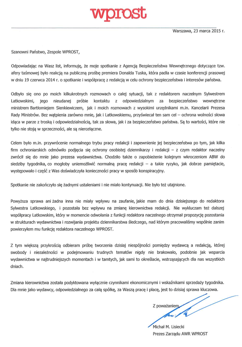 Z najwyższym niepokojem przyjęliśmy tryb i formę zmiany na stanowisku redaktora naczelnego tygodnika Wprost. Zbiega się ona w czasie z wyjściem na światło dzienne tzw. afery podsłuchowej, wśród których istnieje dokument ABW dotyczący spotkania Pana Prezesa z funkcjonariuszami tej służby. Treść tej notatki poddaje w wątpliwość wspólną linię redakcji i wydawnictwa dotyczącą tamtych, wstrząsających dla wszystkich dni. Oczekiwalibyśmy odniesienia się przez Pana Prezesa do tej sytuacji i odpowiedzi na pytanie, czy te dwie sprawy są ze sobą związane.