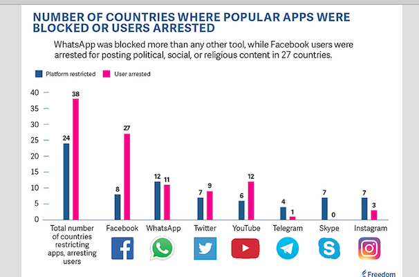 •27% użytkowników Internetu żyje w krajach, w których za publikowanie, udostępnianie lub nawet „polubienie” treści na Facebooku ludzie trafiali do więzień.