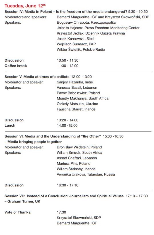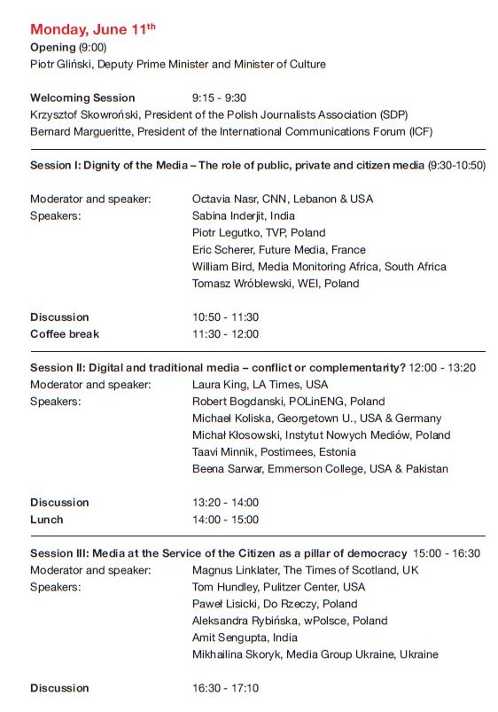 W dniach 11 – 12 czerwca w Domu Dziennikarza, przy ul. Foksal 3/5 w Warszawie gościli dziennikarze m. in. z USA, Wielkiej Brytanii, Francji, Indii, RPA, Libanu, Ukrainy, Rosji. Wraz z polskimi kolegami rozmawiali o mediach w Polsce i na świecie. W programie konferencji było siedem paneli dyskusyjnych, m.in. na temat godności mediów i dziennikarstwa oraz sytuacji mediów w Polsce.