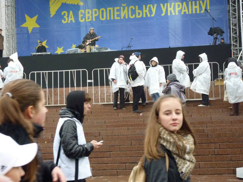 Organizacja wiecu perfekcyjna jakby połowa funkcjonariuszy MSW brała w niej udział albo sprawna struktura partyjna .. duża struktura partyjna taka na przykład jaką ma Partia Regionów. Może jedni i drudzy? Do tego wszystkie media w karnej gotowości: wozy transmisyjne podłączone, a za kamerami stoją już operatorzy. Pierwsza myśl jest oczywista: rząd zorganizował kontrdemonstrację, żeby pokazać, że „większość” społeczeństwa jest przeciwna integracji z Unią Europejską. Kolejne rozmowy wprowadzają jednak jeszcze większy zamęt. Demonstracja jest „ZA” Europą i za integracją europejską. Wszystkich tych ludzi sprowadzono do Kijowa, żeby okazywali swoje poparcie dla układu stowarzyszeniowego? Ale przecież rząd Ukrainy właśnie ogłosił, że nie zamierza podpisywać układu ...