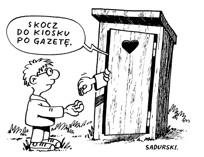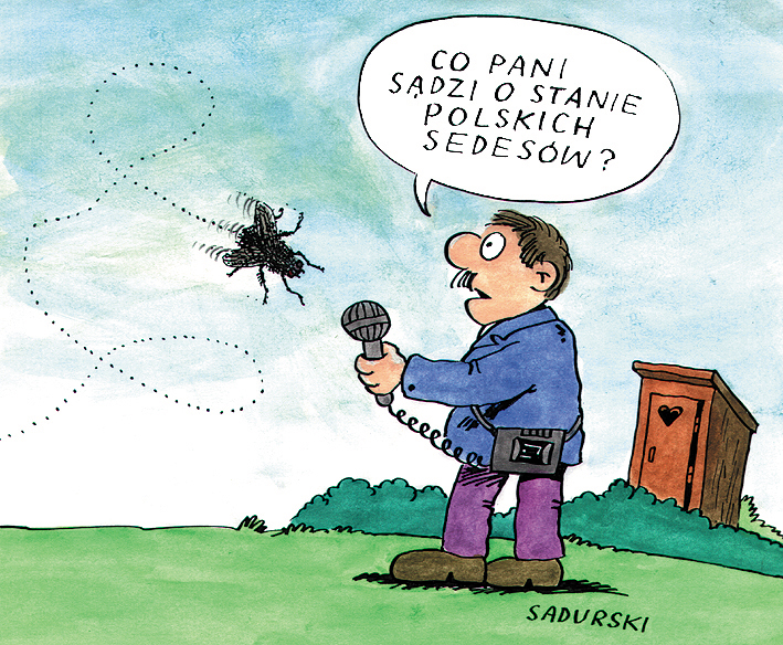 Na Pana rysunku reporter telewizyjny na tle sławojki wystawia mikrofon i pyta muchy: „Co pani sądzi o stanie polskich sedesów”?
