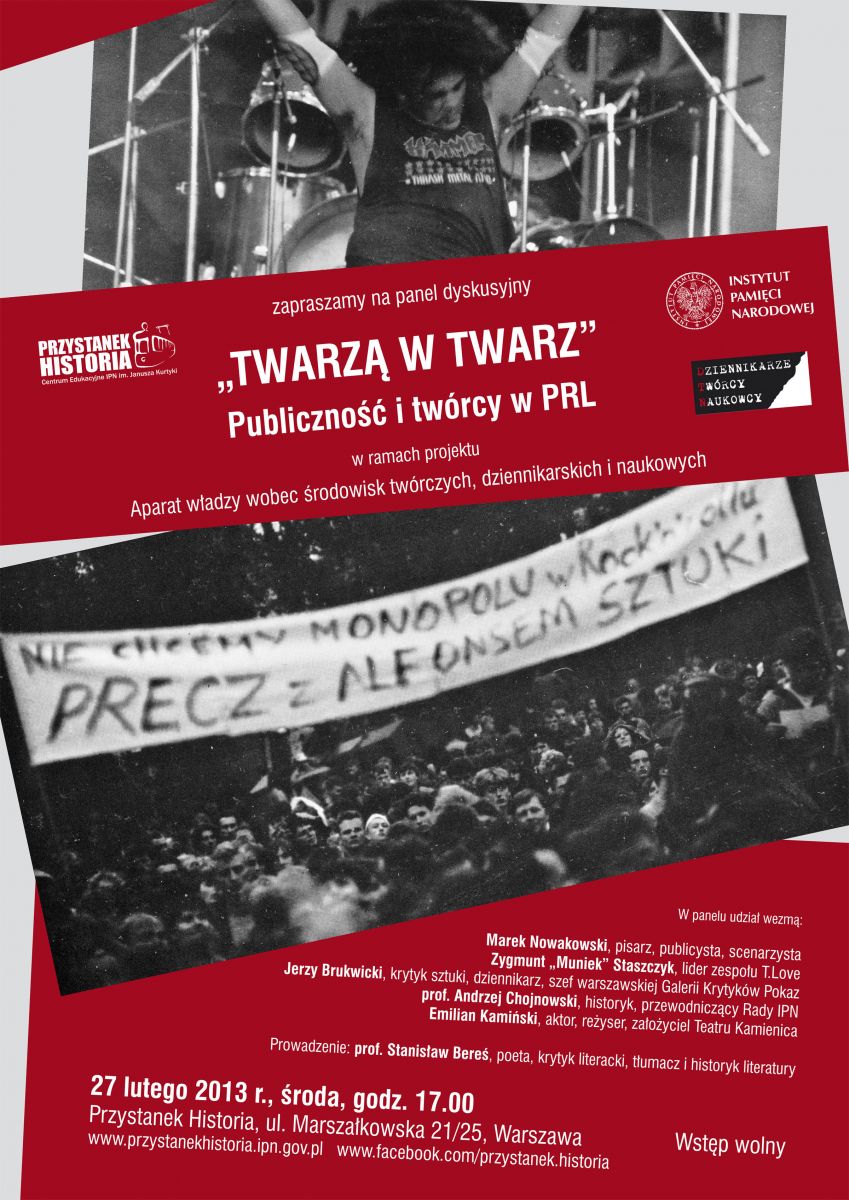 Czy w okresie PRL miały one taką formę jak dziś? W jaki sposób publiczność reagowała na treści polityczne, a na ile sama je kreowała? Czy emocje publiczności były sterowane i sterowalne? Co mówią nam archiwalia o tych wydarzeniach? Jak władza podchodziła do sztuki, do wolności twórczej? Czy istniał mityczny „wentyl bezpieczeństwa”? Jakie miejsce w systemie miał twórca i jego odbiorca? Dlaczego władze zgadzały się na pewne eksperymenty twórcze, zakazując innych? - na te i inne pytania odpowiedzą Marek Nowakowski, Zygmunt Staszczyk, Jerzy Brukwicki,Emilian Kamiński i prof. Andrzej Chojnowski.
