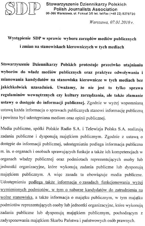 Stowarzyszenie Dziennikarzy Polskich protestuje przeciwko utajnianiu wyborów do władz mediów publicznych oraz mianowaniu i odwoływaniu osób na stanowiska kierownicze bez jakiegokolwiek uzasadnienia.