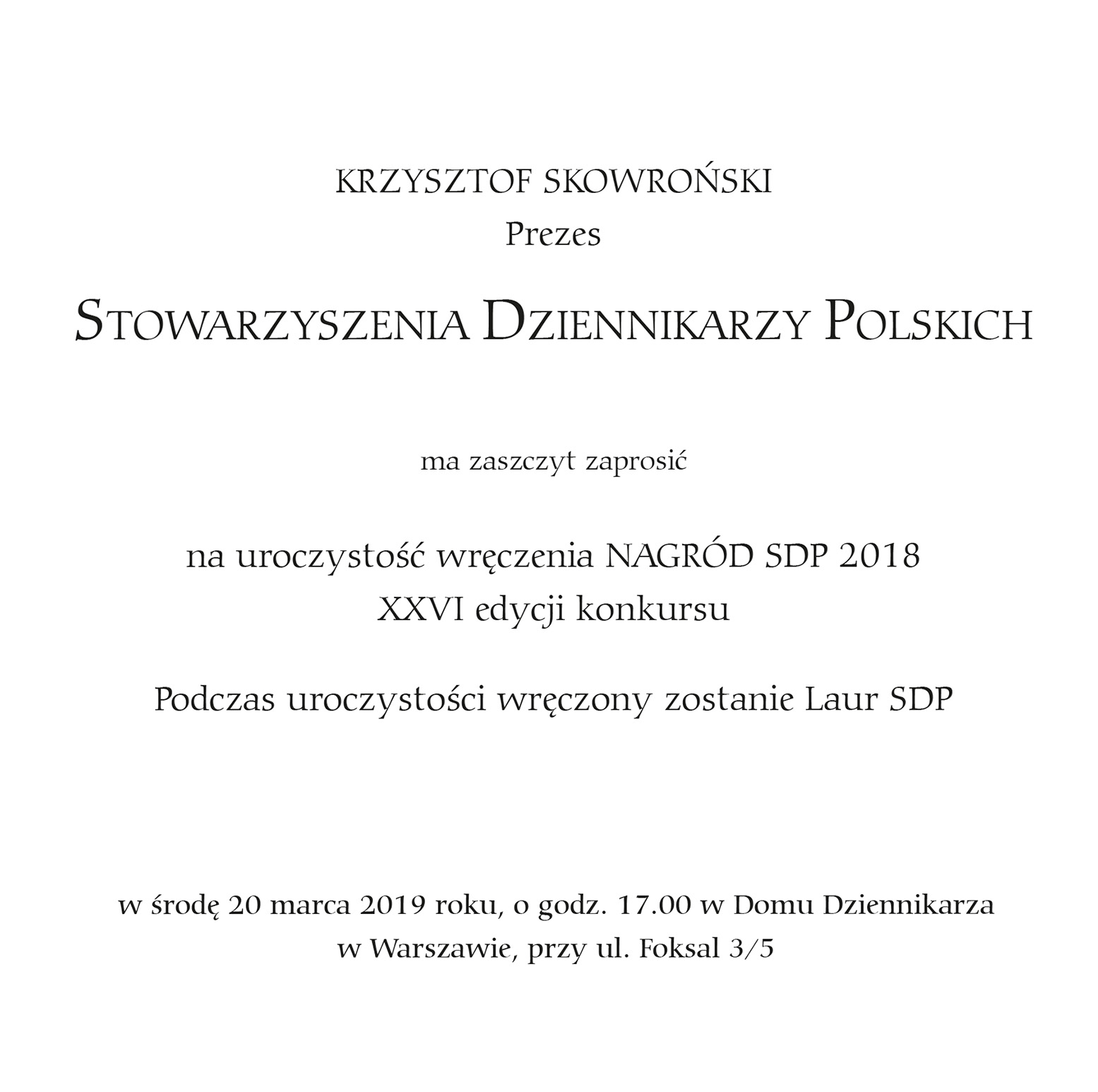 Stowarzyszenie Dziennikarzy Polskich zaprasza na uroczystość ogłoszenia wyników i wręczenia nagród 26. edycji konkursu o Nagrody SDP na najlepsze prace w polskiej prasie, radiu, telewizji i internecie, która odbędzie się 20 marca br., o godz. 17.00. Tych z Państwa, którzy nie będą mogli do nas przyjechać, zapraszamy do śledzenia transmisji na portalu www.sdp.pl