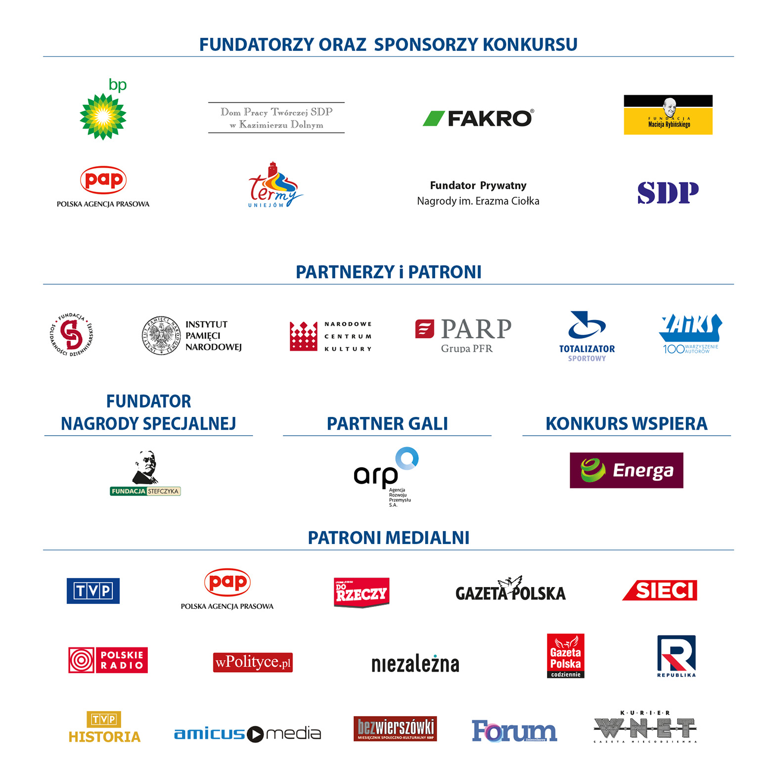 Fundacja Solidarności Dziennikarskiej, Instytut Pamięci Narodowej, Narodowe Centrum Kultury, Polska Agencja Rozwoju Przedsiębiorczości, Totalizator Sportowy Sp. z o.o., Stowarzyszenie Autorów ZAiKS