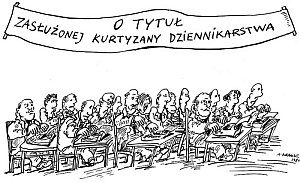 A taki: jakby w szkolnych ławach siedzą panowie w garniturach przy maszynach do pisania. Rywalizują. Wywalone języki, zafrasowane miny, jakby chcieli prześcignąć myśli nauczyciela. I napis: „O tytuł zasłużonej kurtyzany dziennikarstwa". Nadal jest aktualny? Polscy dziennikarze zawodowo się prostytuują?